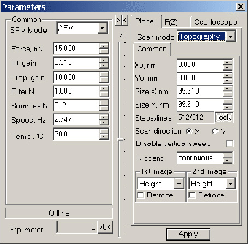 In the left part of the Parameters window main feedback parameters, that are important during surface scanning and sample landing can be found: